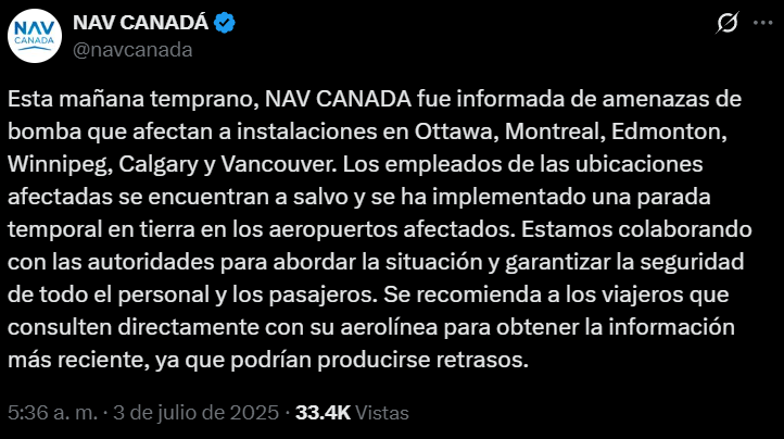 Ottawa (CBNnoticias) – Seis aeropuertos canadienses suspendieron temporalmente sus operaciones en la mañana de este jueves 3 de julio, debido a una serie de amenazas de bomba, según informó la Corporación Nav Canada, encargada de la navegación aérea civil en el país.