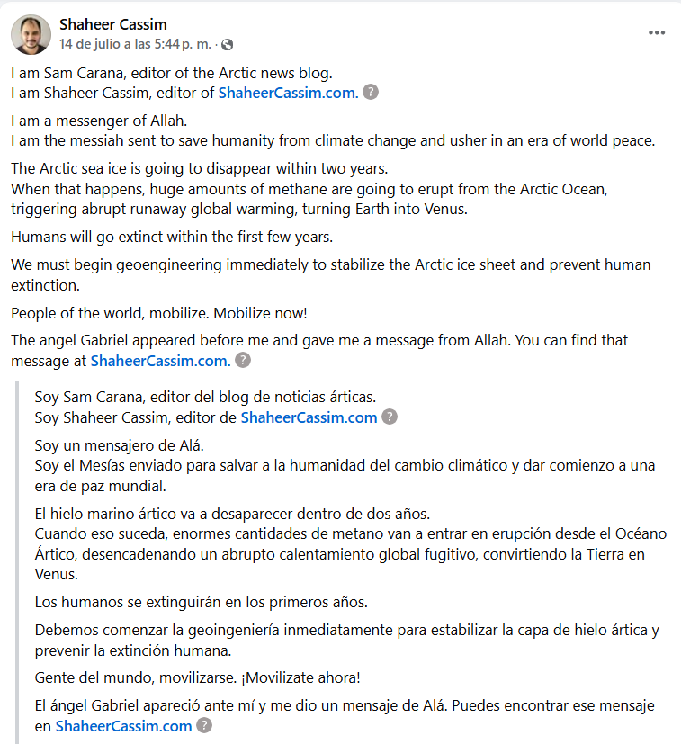 En su publicación, Cassim dice que él es el «mesías enviado para salvar a la humanidad del cambio climático y marcar el comienzo de una era de paz mundial».