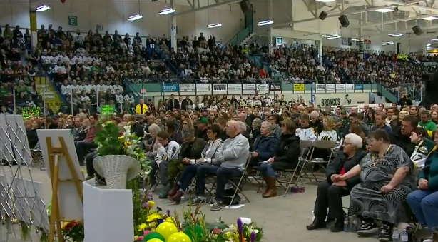 Humboldt, Saskatchewan (CBNnoticias) – Cientos de personas, entre ellas el primer ministro de Canadá, Justin Trudeau, se reunieron anoche en el estadio cubierto Elgar Petersen Arena, de la localidad de Humboldt, provincia de Saskatchewan, región central canadiense, donde se realizó una vigila, para honrar la memoria de los 15 integrantes del equipo junior de hockey Broncos de Humboldt, quienes perecieron en un accidente de tránsito el pasado viernes cuando el bus en que viajaban colisionó con un tractocamión en una carretera a unos 400 kilómetros al norte de la ciudad de Regina, capital de esta provincia.
