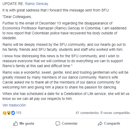 En el mensaje dirigido a colegas del señor Gencay en la Universidad Simon Fraser donde laboraba como profesor de Economía, se señala que: “la policía colombiana ha recuperado su cuerpo fuera de Medellín”.