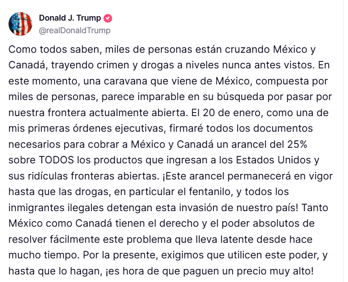 Donald Trump dijo, a través de un mensaje en las redes sociales que firmará una orden ejecutiva para imponer dicho gravamen a Canadá y México, tan pronto como asuma el mandato.