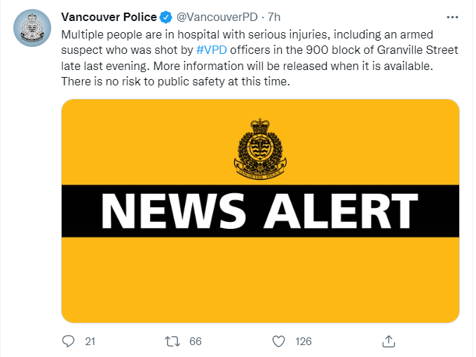 A través de la cuenta en Twitter, el Departamento de Policía de Vancouver, dio a conocer que varias personas resultaron heridas, entre ellas el atacante, durante una nueva acción violenta en zona céntrica de Vancouver.